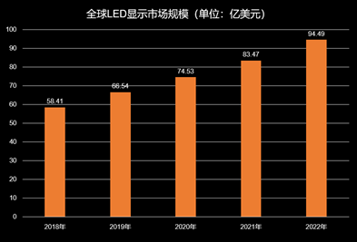 小間距LED品類增多,并開始與DLP和LCD競(jìng)爭(zhēng)室內(nèi)顯示市場(chǎng)。從全球LED顯示市場(chǎng)規(guī)模的數(shù)據(jù)上顯示,2018年到2022年,小間距LED顯示產(chǎn)品性能優(yōu)勢(shì)明顯,形成對(duì)傳統(tǒng)LCD、DLP技術(shù)的替代趨勢(shì)。