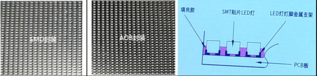 AOB是表貼模組底部覆膠技術(shù),也是在傳統(tǒng)SMD小間距模組燈珠間隙里封裝半層透明膠體,解決防護(hù)性問題,其本質(zhì)上還是SMD小間距產(chǎn)品,存在局限與潛在風(fēng)險(xiǎn),例如難以做到P1.25以下間距,只能用TOP燈珠,表貼工藝的潛在問題仍然存在等。
