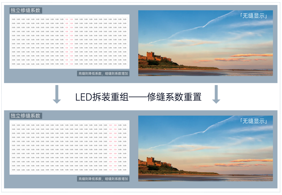該方案通過(guò)直接修改校正系數(shù)調(diào)整LED亮度,達(dá)到修復(fù)亮暗線的效果。該方案適用于固裝項(xiàng)目,通過(guò)一次修縫調(diào)整即可達(dá)到理想顯示效果。