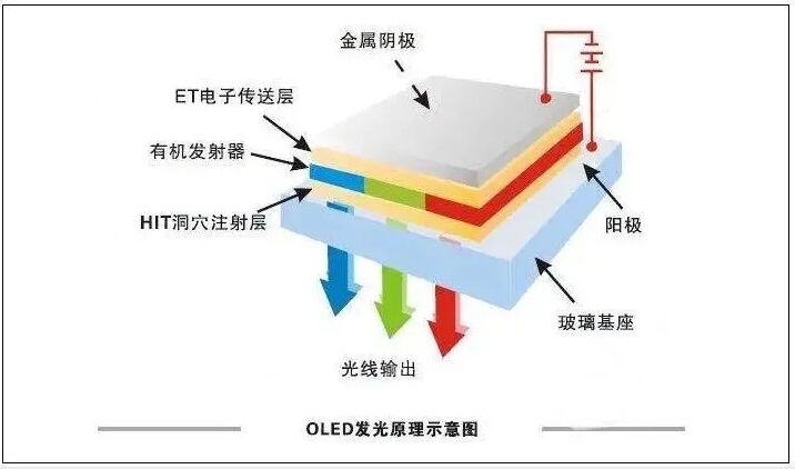 OLED在電場的作用下,陽極產生的空穴和陰極產生的電子就會發生移動,分別向空穴傳輸層和電子傳輸層注入,遷移到發光層。當二者在發光層相遇時,產生能量激子,從而激發發光分子最終產生可見光。