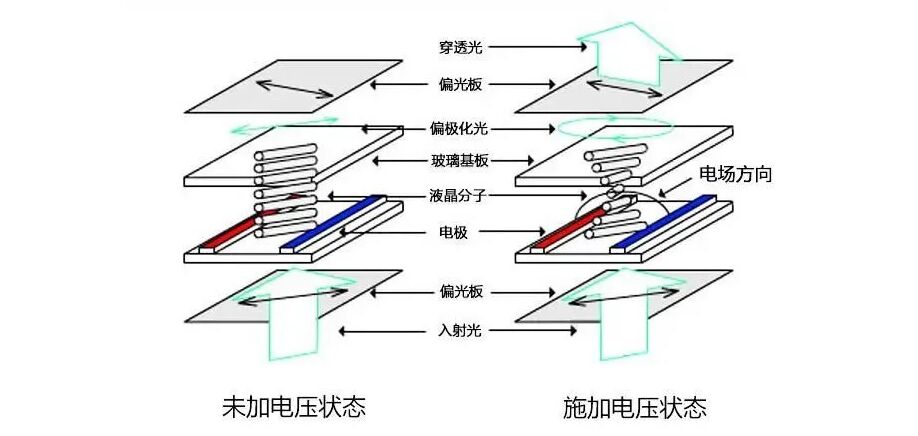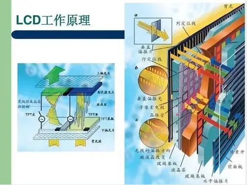 LCD拼接屏的構造是在兩片平行的玻璃當中放置液態的晶體,兩片玻璃中間有許多垂直和水平的細小電線,透過通電與否來控制桿狀水晶分子改變方向,將光線折射出來產生畫面。