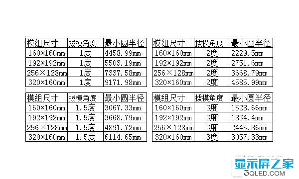 以下是市面上最常見的led顯示屏模組規格和常見的底殼拔模角度(1、1.5、2、3度)以及它們可形成的圓弧的最小半徑: