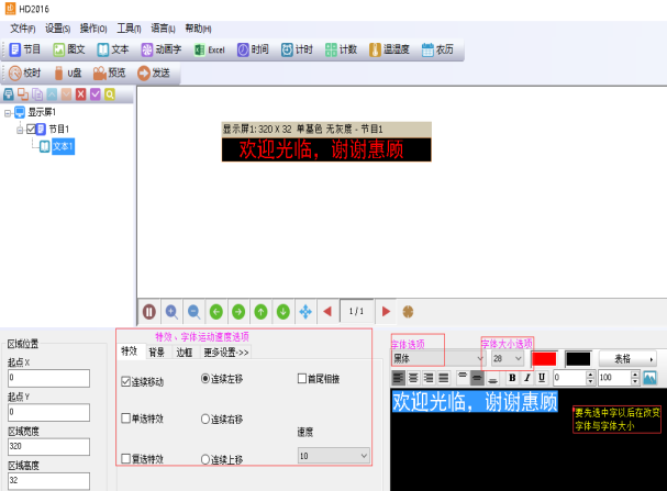 1.3然后在右下角黑色區(qū)域打字、改變字體、和字體的大小,選擇走字特效即可(注:如果文字較多特效選擇連續(xù)移動(dòng)、連續(xù)左移)