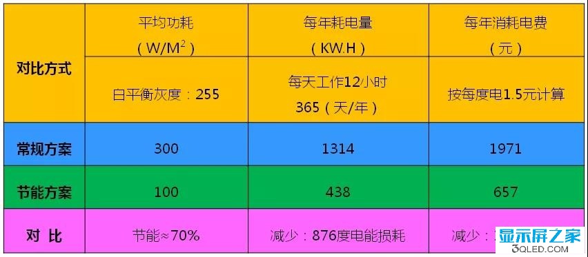 綜合采用LED節能方案產品對比普通產品,每平米每年可節約876度電能,按1.5元/度電費計算,每平米每年可節約1314元,如下表(采用P10-1平米進行對比數據):