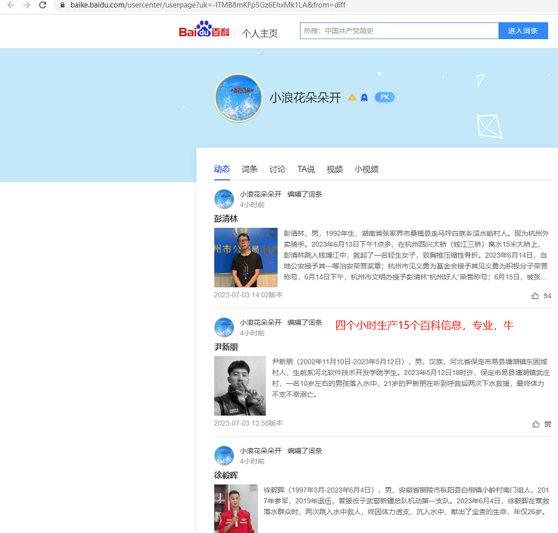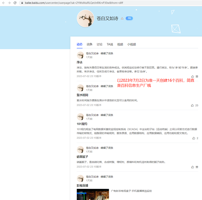 當(dāng)小編們打開第一個(gè)百科創(chuàng)作者蒼白又如詩(shī)時(shí)驚掉小編的下巴,這哥們一天之間2023年7月2日當(dāng)天創(chuàng)建了16個(gè)百科詞匯,再看下另外一個(gè)賬號(hào)浪花朵朵開更厲害四個(gè)小時(shí)創(chuàng)建了15個(gè)詞匯,難道這就是業(yè)內(nèi)傳說(shuō)的專業(yè)“賣詞人”?大家可以看下包含了各行各業(yè)的詞匯,到了這里各位評(píng)估下,這種賬號(hào)的信息可信度有多少呢?這個(gè)小編不說(shuō)了大家自己腦補(bǔ)。。。。。