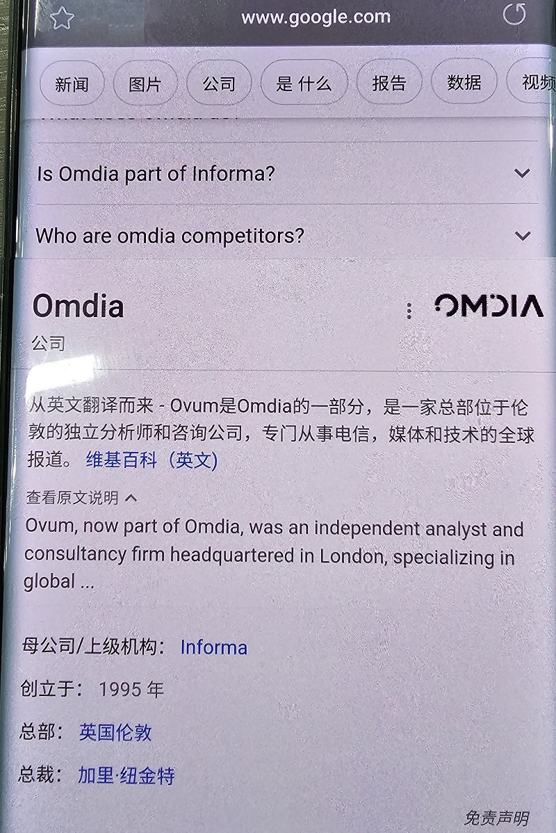 仔細(xì)一查發(fā)現(xiàn),Omdia在國(guó)內(nèi)沒(méi)有任何官網(wǎng),辦事機(jī)構(gòu)信息,難道這證書難道是自己。。。。。查不到就看看百度百科吧!