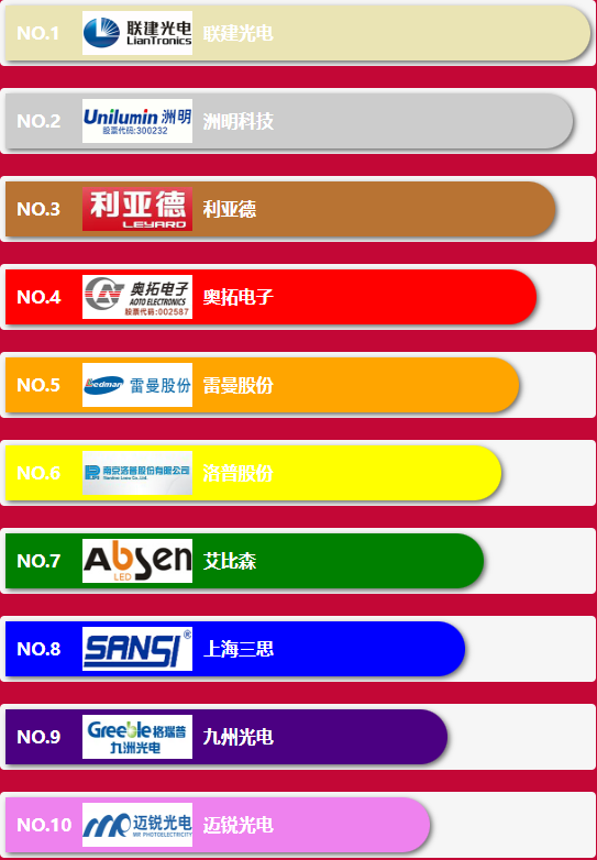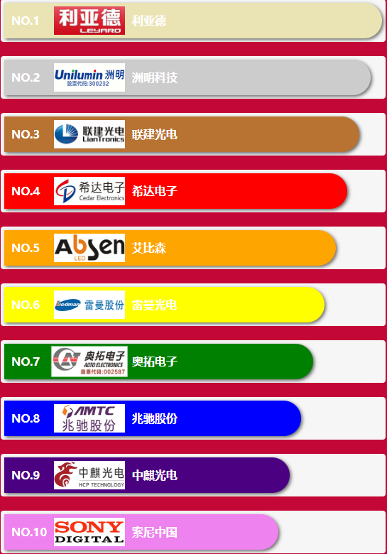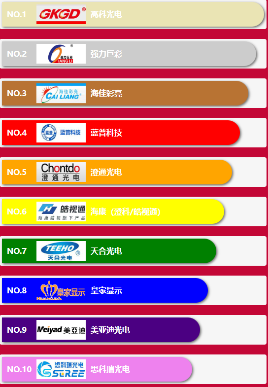小間距十大品牌十大品牌前10名企業分別為:利亞德,洲明科技,聯建光電,希達電子,艾比森,雷曼光電,奧拓電子,兆馳股份,中麒光電,索尼中國。Mini & Micro