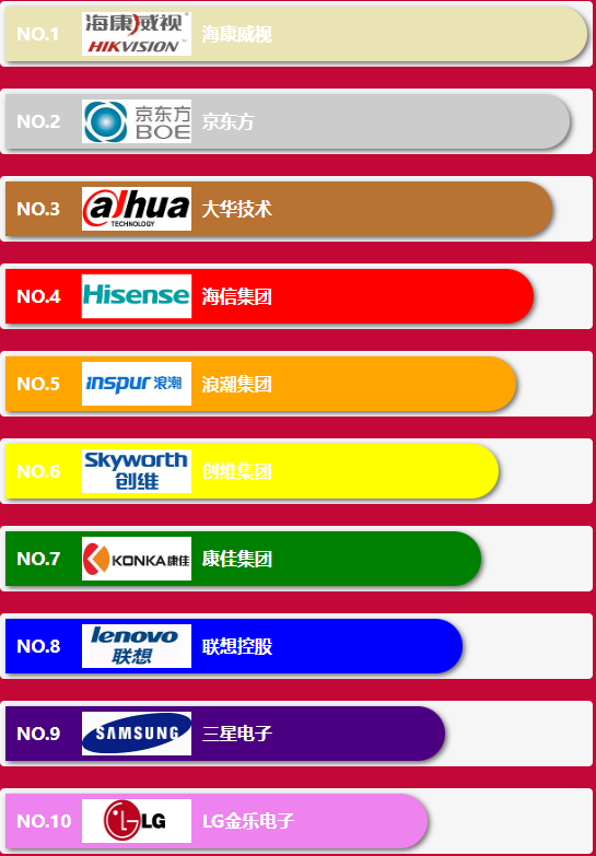led顯示屏跨界入行十大品牌前10名企業分別為:海康威視,京東方,大華技術,海信集團,浪潮集團,創維集團,康佳集團,聯想控股,三星電子,LG金樂電子,這些企業一般從事與