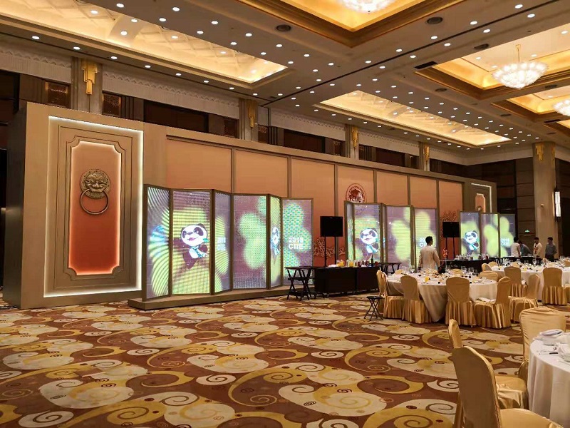 上海led有限公司為此次國際進出口博覽會專業定制了此款LED透明折疊屏風,用以滿足國際高規格的接待要求,彰顯我國在透明屏領域的創新實力。該LED透明折疊屏風畫面精美靚麗,富有科技感,屏體簡潔典雅大方,成為了宴會廳一道亮麗的風景線,營造了整體的歡愉氣氛和獨特的視覺效果。