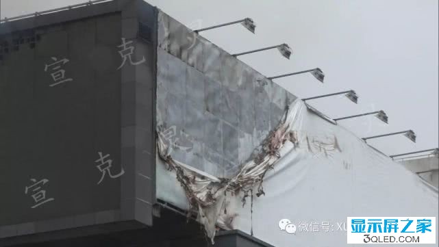 記者注意到:這塊LED大屏已經被燒裂開來,表面的一塊塊方塊有一些已經被燒融,大部分被熏黑燒焦。