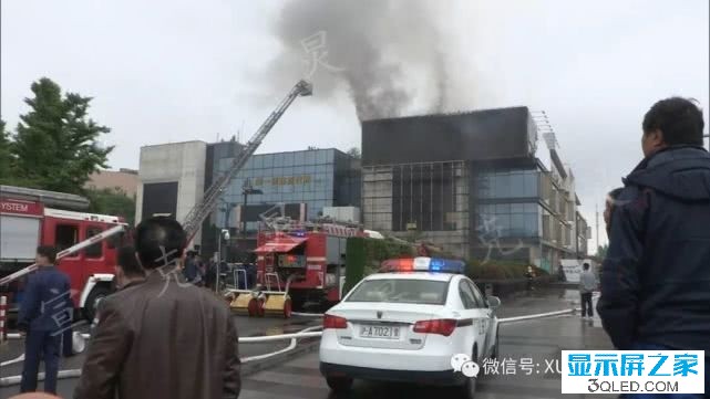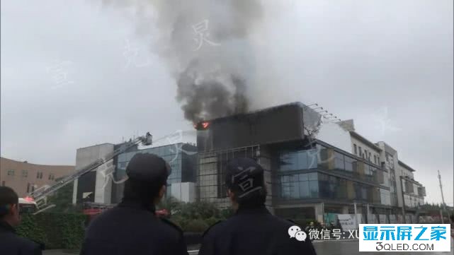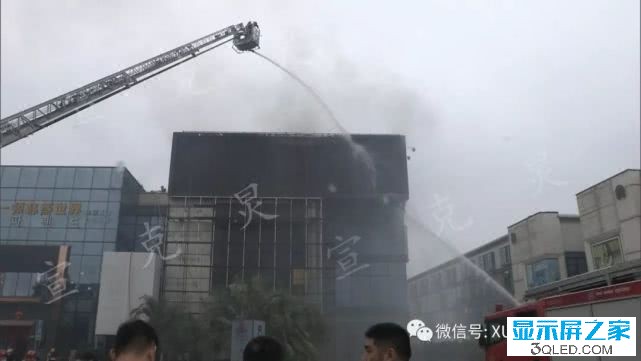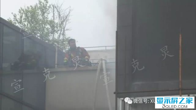 明火直躥半空中,火勢已經從LED大屏朝內部蔓延,也有消防隊員已經上到高樓上展開內攻滅火。