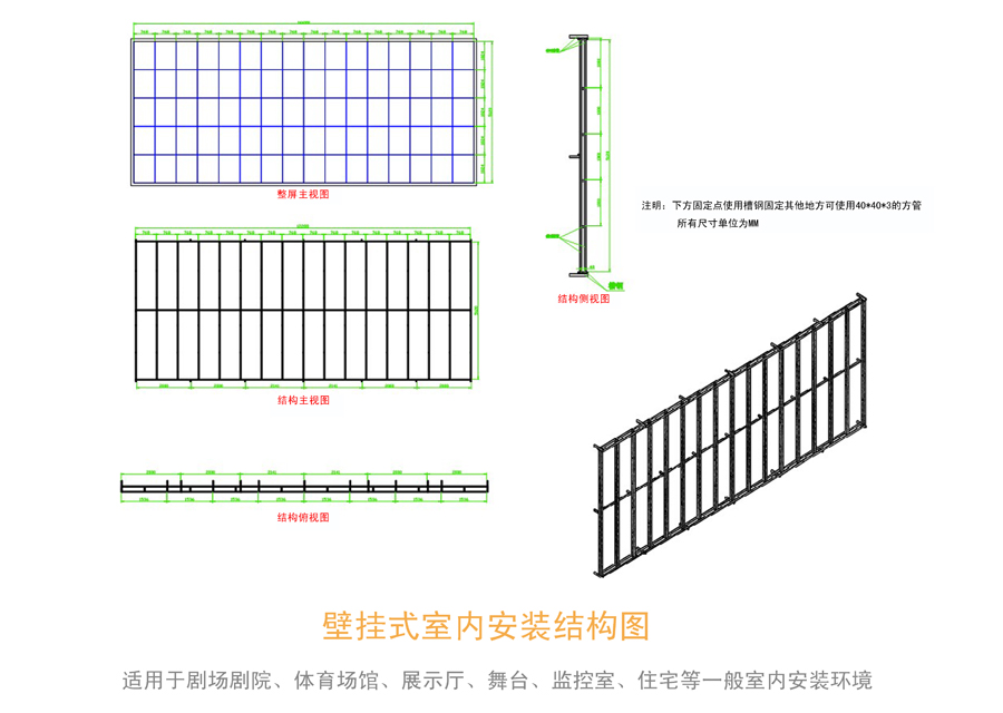 5.安裝鋼結構框架:室內P3LED全彩顯示屏為輕質鋼架,在相應的梁柱部分采用化學鉚栓鉚固鋼板作為承托結構,顯示屏鋼制框架與鉚固定鋼板連接。